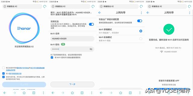 在完成荣耀路由X2的基础设置之后,咱们再来聊一聊路由器的手机互联功能,首先我们需要在手机上安装“华为智能家居App”,连接对应的Wi-Fi信号后,手机便会自动弹出设置页面,在设置过程中,荣耀路由X2会自动进行拨号上网,这对于经常忘记账号密码的用户来说,真的是非常方便,只需几步很简单的操作,即可快速完成设置!