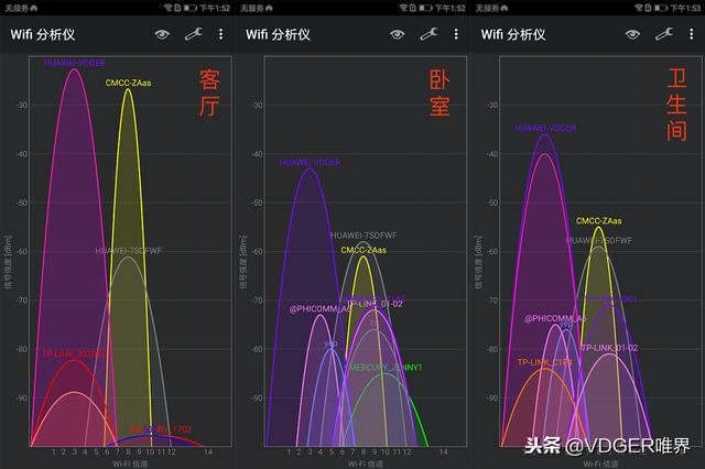 在120平米的室内,通过Wi-Fi分析仪得出的数据显示,客厅、卧室、卫生间等处,其中最远处距离路由器10m的卫生间,信号强度也都能维持在-40dBm以上,综合表现非常给力!